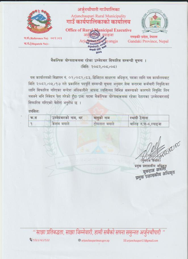 वैकल्पिक योग्यताक्रममा रहेको उम्मेदवार सिफारिस सम्बन्धी सूचना।